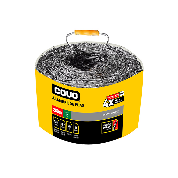 Alambre de púas de tradición, de calibre grueso con la púa entrelazada en la línea del alambre, Fabricado en acero galvanizado en caliente, ideal para cercas perimetrales (confección de concertina de seguridad), uso en la ganadería y sector agrícola de forma general.